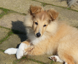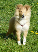 Toen T'Pau 7 maanden oud was hebben we gekeken of zij interesse had in het oorspronkelijke werk van de Sheltie, het schapenhoeden. Net als haar moeder Nyota bleek T'Pau een natuurtalent te zijn, ze hield luid blaffend de schapen mooi aan de gang. |